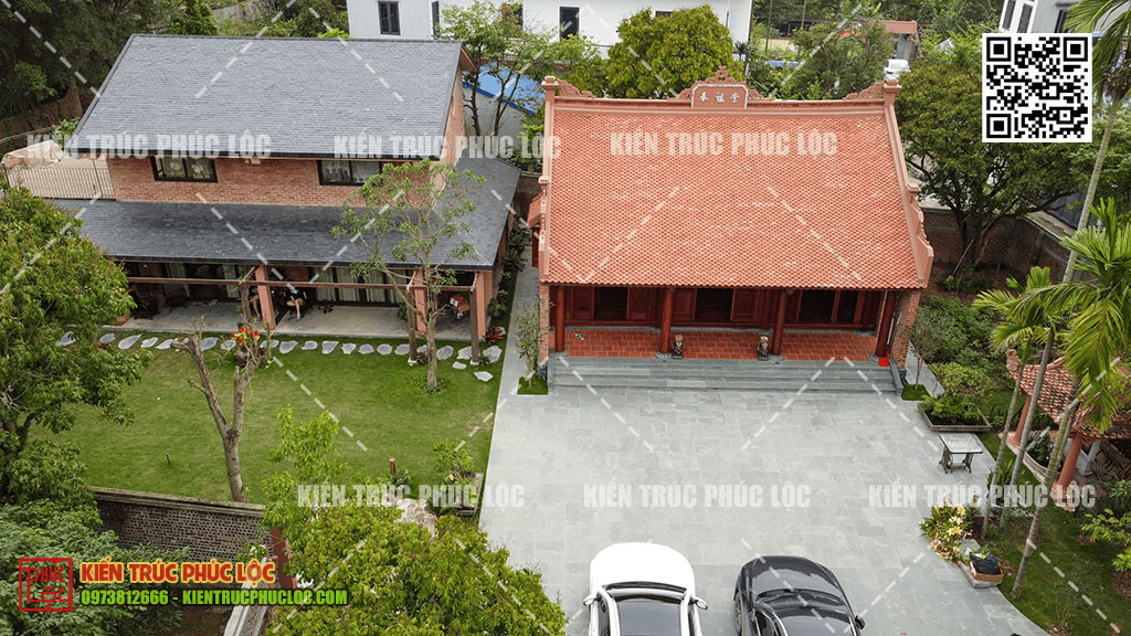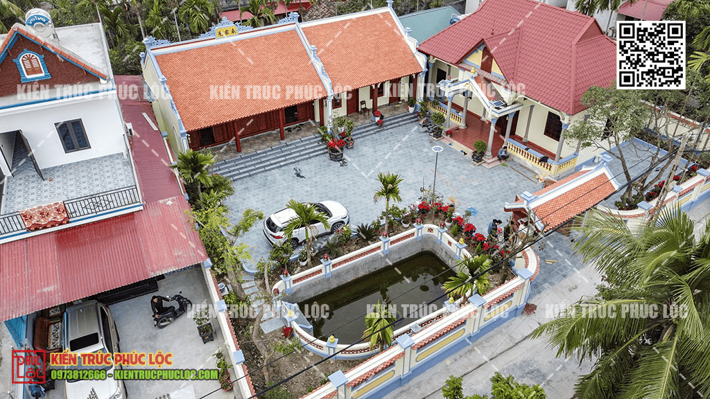 Với những nhà gỗ có sân rộng, quý gia chủ có thể bố trí hai hàng cau cảnh song song theo lối đi từ cổng vào hiên, tạo cảm giác trang trọng và rõ trục dẫn hướng. Cách sắp xếp này giúp dòng khí từ ngoài cổng được dẫn mềm mại vào không gian chính, đồng thời tô đậm vẻ uy nghi của cửa gỗ, hàng cột cái, cột quân phía trước.
